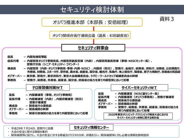 大会のセキュリティに関するあらゆる施策は、政府の「セキュリティ幹事会」の下で進められています。「セキュリティ幹事会」の下には、物理的な対策を担う「テロ等警備対策ワーキングチーム」と、サイバーセキュリティの施策を進める「サイバーセキュリティ・ワーキングチーム」が置かれています。そしてこれらのワーキングチームの下に、テーマごとに各府省庁課長級の会合が数多く設けられ、様々な施策が推進されています。