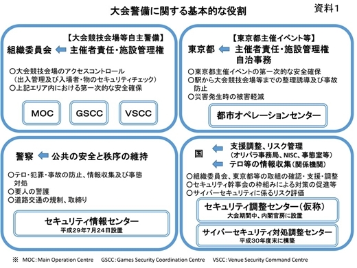 組織委員会は、大会の競技会場で警備員などによる自主警備を実施します。大会時には、「MOC (Main Operation Center)」、「GSCC(Games Security Coordination Center)」、「VSCC(Venue Security Command center)」などが組織委員会に設けられる予定です。