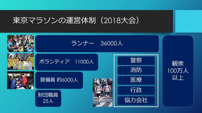 東京マラソンは、多くのランナーに加え、延べ1万1000人のボランティアと約6000人の警備員、財団職員、その他にも警視庁や東京消防庁だけではなく医療、行政関係者、そして設営撤去担当の企業などを含めた多くの方々の協力で成り立っています。そしてその観衆は毎年100万人を超えています。競技場や球場で行われるスポーツと比較すると、観衆が非常に多い、桁違いな規模の大会だと理解いただけると思います。