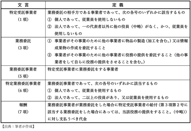 「特定受託事業者」(1項)がいわゆるフリーランスを指しています。そして、その「特定受託事業者」に「業務委託」(3項)する事業者全般が「業務委託事業者」(5項)とされた上で、「業務委託事業者」のうち従業員を使用するなどしているものについて「特定業務委託事業者」(6項)とされています。