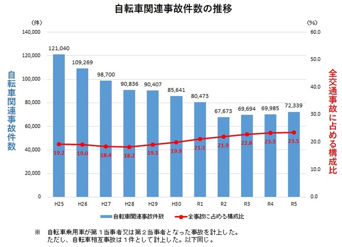 警察庁が公表している資料によると、平成29年以降、全交通事故に占める自転車関連事故の割合と件数がともに増加傾向にあり、令和5年の割合は23.5%に至り、件数も72,339件と前年より2,354件増加しています。