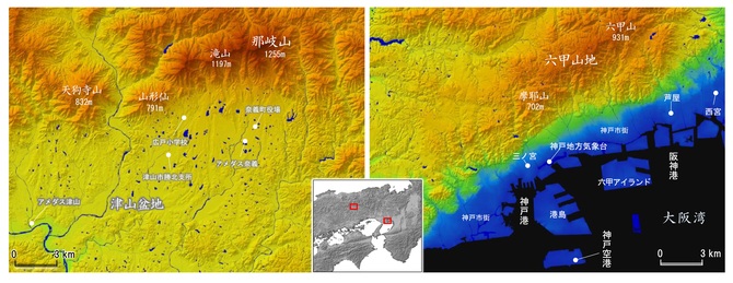 図1に地形図を示す。左図は岡山県奈義町とその周辺であり、鳥取県との県境に位置する那岐山(なぎさん)の南麓地域である。この地域こそ、日本三大局地風の1つ、広戸風のふるさとにほかならない。その広がりは、奈義町から津山市東部にかけての、東西20キロメートル、南北10キロメートルほどにすぎない。那岐山は、標高1255メートルで、それほど急峻な山ではない。中国地方を日本海側と瀬戸内側に分ける分水嶺の中国山地の南縁に位置している。奈義町の町名は那岐山に由来する。奈義町は1955(昭和30)年に3村が合併して誕生したが、かつて那岐山の北側の鳥取県内に那岐村(なぎそん)が存在した(1889~1935)ため、町名を「那岐町」とせず「奈義町」の表記を採用したようだ。