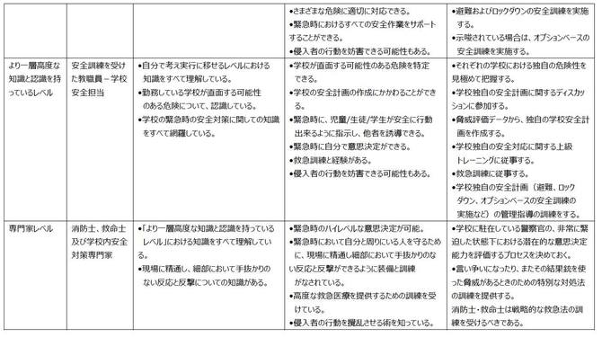 学校が⾏う危機対応訓練は、⽣徒の発達と認識レベルに焦点を合わせ、かつ教師や職員などの役割や認識レベルも考慮に⼊れなければならない。