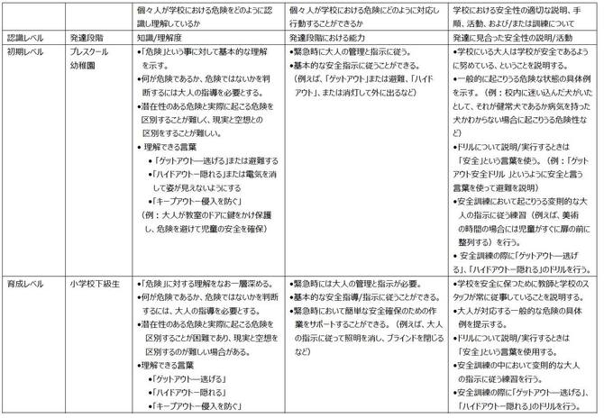 危機管理マニュアル作成時において⼤切と思われることは、「個々⼈が学校における危険をどのように認識し理解しているか」という知識や理解度を分析することだ。そして発達段階における能⼒を具体的に評価することで、発達に⾒合った段階的な訓練メニューなどをつくることができると思われる。