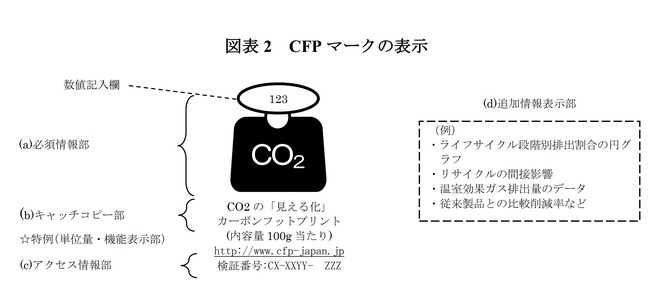 ①の「CFPマーク認定事業者」は、製品のライフサイクルでのCO2排出量を「見える化」して、製品にCFPのマーク(はかりの形)を表示します。その例は、図表2 に示すとおりです。詳細は、第10回で紹介していますので、説明は省略します。