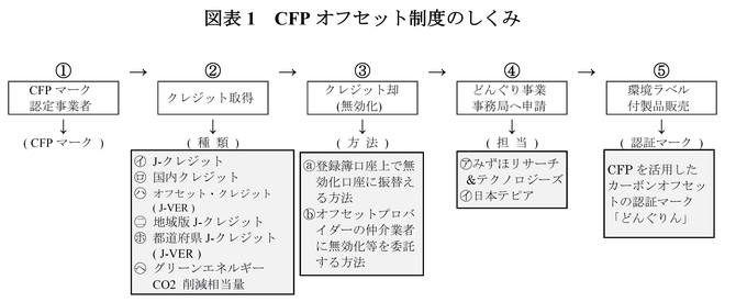 「CFPオフセット制度」とは、CFP を算定した事業者が、別途取得した同量のクレジットによりカーボン・オフセットを行ったことを事務局が認証し、製品等に認証マーク「どんぐりん」を使用する事業を実施することです。CFPオフセット制度のしくみは、図表1のとおりです。