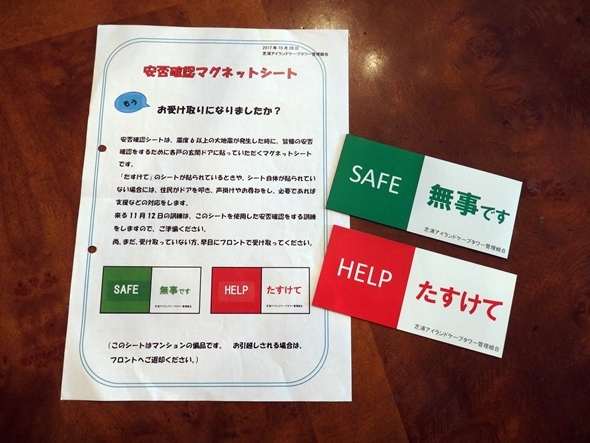 訓練への参加者が増え続けている一つのきっかけは、「安否確認シート」の配布。「全住戸にシートを投函してしまうと、その場で捨てられてしまうかもしれない。そうならないように、管理人室に取りに来てもらうようにしました。一度の投函では来られない方もいらっしゃるので、二度、三度、呼びかけ続けました。残るは100戸となり、個別訪問を実施。すると中には、日本語が読めない外国人もいらっしゃることがわかりました。各世帯に説明をし、出張などでいらっしゃらない住戸など残すは5%というところまで来ました。友人宅に遊びに行ったりすると玄関前にシートが貼ってあると、すごく嬉しいですね」(木股さん)。ワーキングチームの方の丁寧な活動が実を結び、住民一人ひとりの意識に変化が見えてきています。