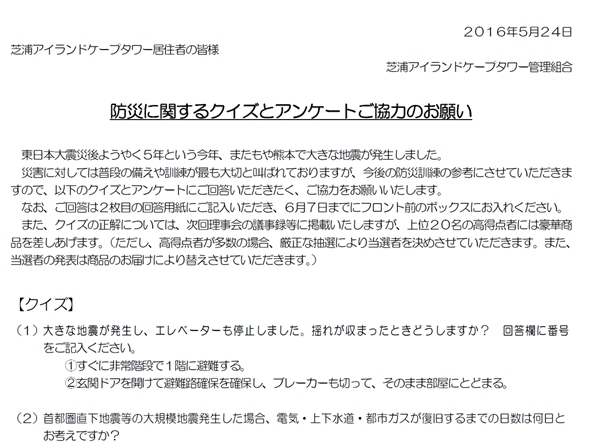2016年5月、住民向けの防災に関するクイズとアンケートを実施、160名の回答を得ました。