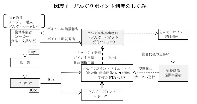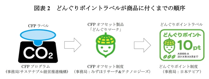「どんぐりポイント制度」とは、「見える化」制度連携活性化事業費補助事業を意味しています。そのしくみは、図表1のとおりです。どんぐりポイントは、CFPオフセット製品にどんぐりポイントマーク、例えば、10ポイント(図中10ptと記載) を付けて、わかりやすく表示しています。