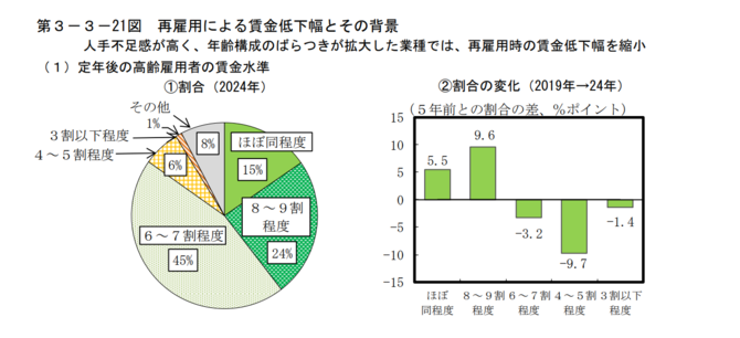 また、内閣府の「令和6年度年次経済財政報告」によると、定年前後の賃金比較で「ほぼ同程度」が15%、「8から9割程度」が24%、「6から7割程度」が45%、「4から5割程度」は6%となっており、特に人手不足感が高く、年齢構成のばらつきが拡大した業種では、再雇用時の賃金低下幅が縮小しているとの分析が示されています。